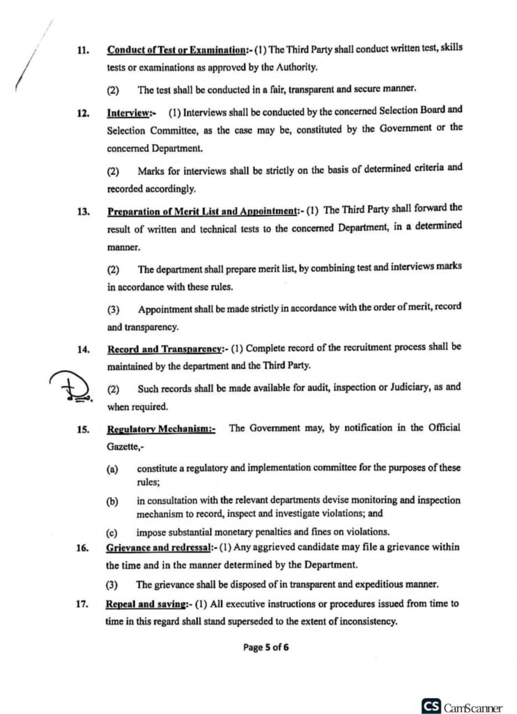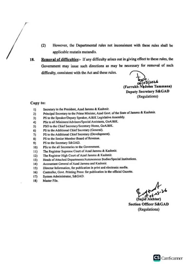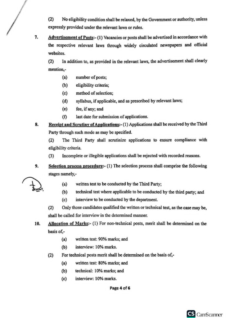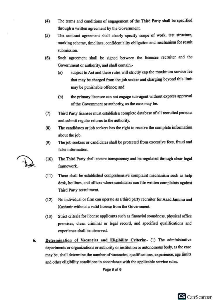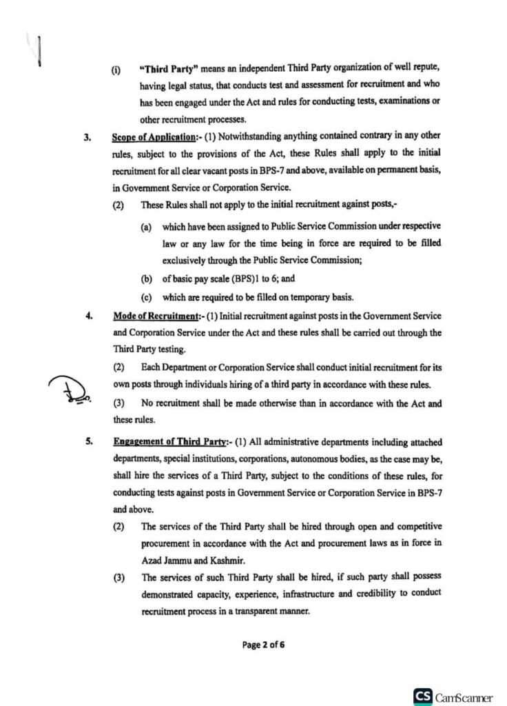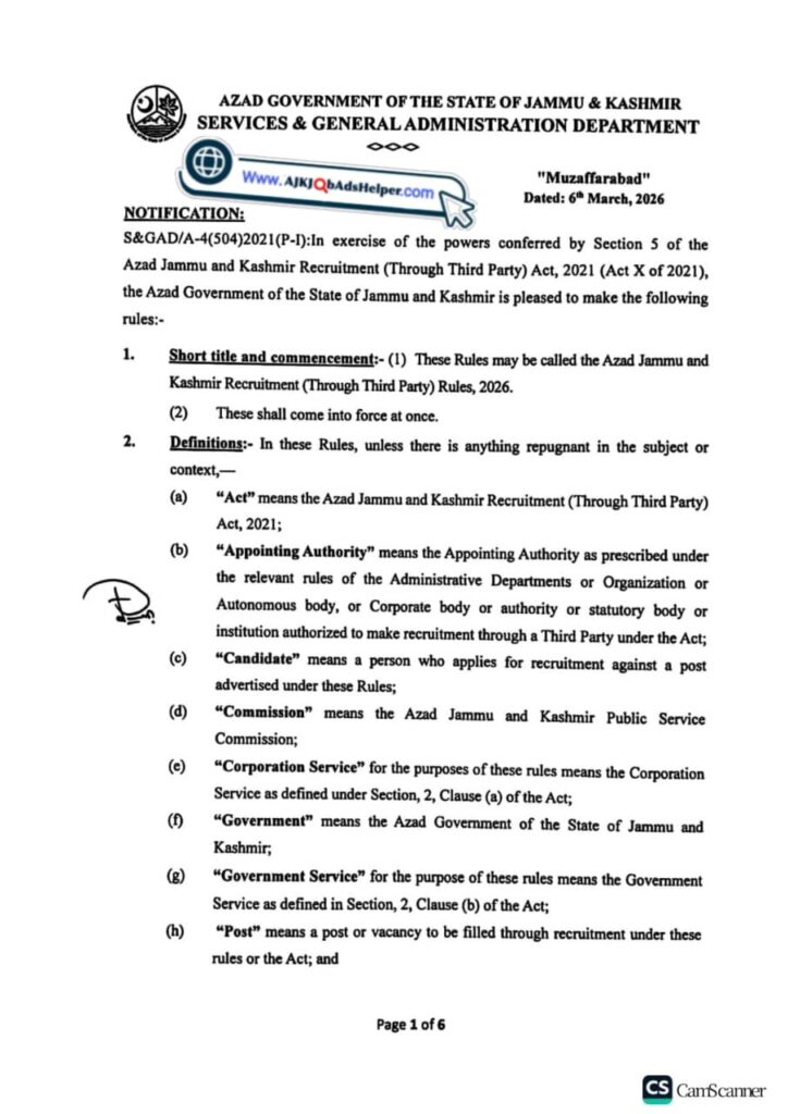 آزاد حکومت ریاست جموں و کشمیر کے “سروسز اینڈ جنرل ایڈمنسٹریشن ڈیپارٹمنٹ” کی جانب سے جاری کردہ ایک حالیہ نوٹیفکیشن کی ہیں، جس کا عنوان “آزاد جموں و کشمیر بھرتی (بذریعہ تھرڈ پارٹی) رولز، 2026” ہے۔اس دستاویز کے اہم نکات اردو میں درج ذیل ہیں:1. بنیادی مقصد اور دائرہ کار• یہ رولز سرکاری ملازمتوں اور کارپوریشن سروسز میں BPS-7 اور اس سے اوپر کی تمام مستقل آسامیوں پر براہ راست بھرتی کے لیے لاگو ہوں گے۔• استثنیٰ: یہ رولز ان آسامیوں پر لاگو نہیں ہوں گے جو پبلک سروس کمیشن کے دائرہ اختیار میں آتی ہیں، یا جو BPS-1 سے 6 تک ہیں، یا جو عارضی بنیادوں پر پُر کی جانی ہوں۔2. تھرڈ پارٹی (تیسرے فریق) کا کردار• حکومت کسی ایسی معتبر اور قانونی حیثیت رکھنے والی تنظیم (تھرڈ پارٹی) کی خدمات حاصل کرے گی جو ٹیسٹ اور اسسمنٹ لینے کی صلاحیت رکھتی ہو۔• بھرتی کے لیے تحریری اور تکنیکی ٹیسٹ یہی تھرڈ پارٹی منعقد کرے گی۔• تھرڈ پارٹی کا انتخاب شفاف طریقے سے کھلے مقابلے (Open Procurement) کے ذریعے کیا جائے گا۔3. بھرتی کا طریقہ کار اور مراحلبھرتی کا عمل درج ذیل مراحل پر مشتمل ہوگا:1. اشتہار: اخبارات اور ویب سائٹ پر واضح اشتہار دیا جائے گا جس میں اسامیوں کی تعداد، اہلیت، سلیبس اور فیس درج ہوگی۔2. درخواستوں کی جانچ: تھرڈ پارٹی درخواستیں وصول کرے گی اور ان کی اسکروٹنی کرے گی۔3. ٹیسٹ: تھرڈ پارٹی تحریری اور (جہاں ضرورت ہو) تکنیکی ٹیسٹ لے گی۔4. انٹرویو: ٹیسٹ پاس کرنے والے امیدواروں کا انٹرویو متعلقہ سرکاری محکمہ خود کرے گا۔4. نمبروں کی تقسیم (Merit Criteria)میرٹ لسٹ بنانے کے لیے نمبروں کی تقسیم اس طرح ہوگی:• غیر تکنیکی (Non-Technical) پوسٹس:• تحریری ٹیسٹ: 90%• انٹرویو: 10%• تکنیکی (Technical) پوسٹس:• تحریری ٹیسٹ: 80%• تکنیکی ٹیسٹ: 10%• انٹرویو: 10%5. امیدواروں کا تحفظ اور شکایات• امیدواروں سے لی جانے والی فیس کی ایک حد مقرر کی جائے گی، اس سے زیادہ وصول کرنا جرم ہوگا۔• امیدواروں کی شکایات کے ازالے کے لیے ایک باقاعدہ نظام (ہیلپ ڈیسک اور ہاٹ لائن) قائم کیا جائے گا۔• تھرڈ پارٹی تمام ریکارڈ محفوظ رکھنے اور اسے آڈٹ یا عدلیہ کے سامنے پیش کرنے کی پابند ہوگی