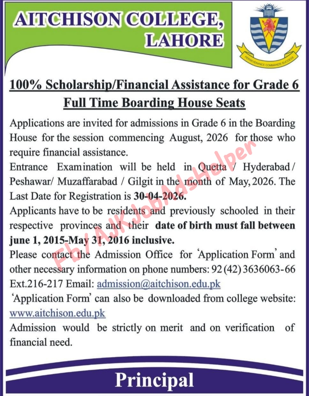 Please contact the Admission Office for Application Form’ and other necessary information on phone numbers: 92 (42) 3636063-66 Ext.216-217 Email: admission@aitchison.edu.pk