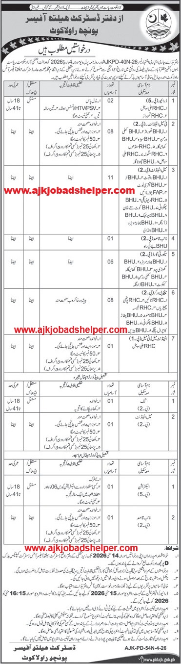 In view of the recent decision of the Supreme Court of Azad Jammu and Kashmir, Muzaffarabad, the advertisement No. 26-AJKPD-40N issued by this office in the Daily Pearl dated March 4, 2026, is hereby cancelled with effect from the date of issue. Applications are invited for appointment on open merit basis to fill the following vacant posts in the Public Health Department, District Health Officer Office, Rawalakot under the jurisdiction of the said department.