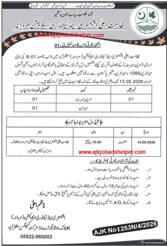 Applications are invited from residents of Azad Jammu and Kashmir including 1989 immigrants and immigrants residing in Pakistan for the appointment against the vacant post of Naib Qasid 01-B (Open Merit) in Directorate General of Elementary and Secondary Education (Male) Muzaffarabad. Eligible candidates can submit their applications to this Directorate during office hours up to 13.05.2026.