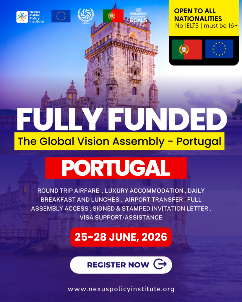 Applications are now open for the Global Vision Assembly 2026 Portugal, a flagship international youth policy and leadership conference organized by the Nexus Public Policy Institute in the heart of Europe. The conference will take place in Portugal from June 25 to June 28, 2026, welcoming 400 global participants for four days of high-level policy dialogue, leadership development, and global networking in the heart of Europe. Selected participants will receive full funding covering Round-trip airfare, full conference access, luxury accommodation, meals, certification, and networking opportunities. Apply now to join one of the leading international policy and youth leadership conferences in Europe.