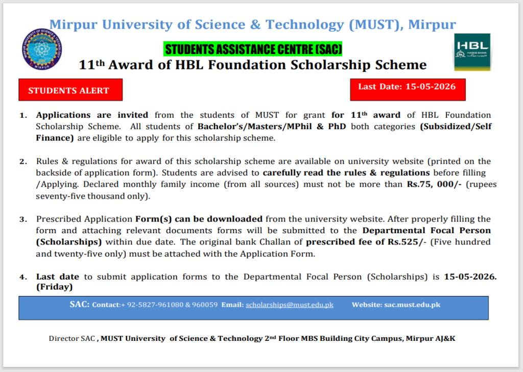 1. Applications are invited from the students of MUST for grant for 11th award of HBL Foundation Scholarship Scheme. All students of Bachelor’s/Masters/MPhil & PhD both categories (Subsidized/Self
