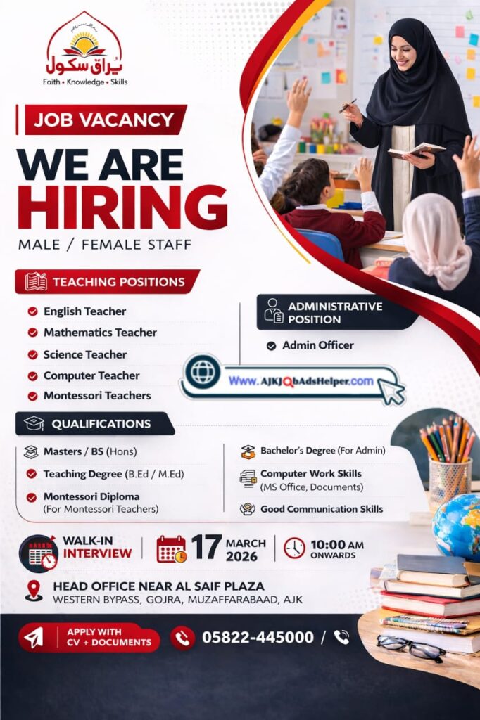 AJK Private JobsJob In Buraq School Muzaffarabad Posted on March 11, 2026March 11, 2026 by ajkjobadshelper 11 Mar ajkjobadshelper Amendment date of Add Office of the Deputy Director, Agriculture Mirpur The President Azad Jammu & Kashmir has been pleased to accord approval for disbursement of salary and pension on the 16th March, 2026