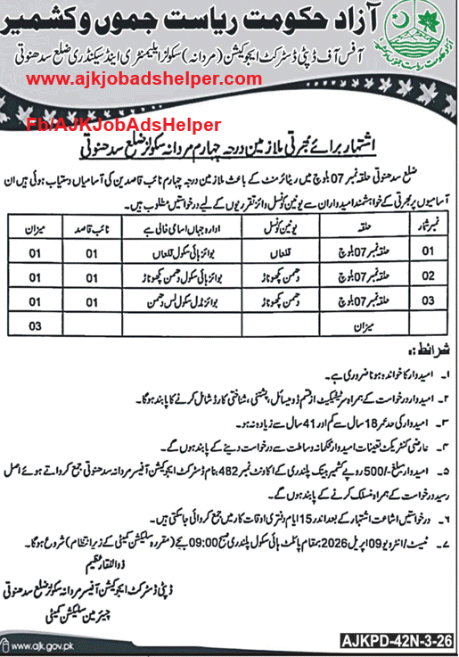 AJK JobsJob in Deputy District Education Officer (M) Sudhnuti, AJK Posted on March 13, 2026 by ajkjobadshelper 13 Mar ajkjobadshelper AJK Local Government Board Muzaffarabad Jobs 2026 Lady Health Worker Job in Health Department, Muzaffarabad