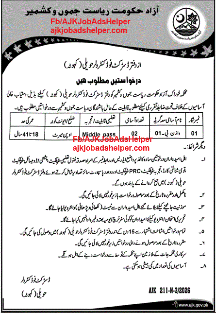 AJK JobsJob in District Food Controller Haveli Kahuta AJK Posted on March 9, 2026March 11, 2026 by ajkjobadshelper 09 Mar Department Food Sector Govt. AJK Last Date 23-03-2026 ajkjobadshelper Amendment add Directorate of Health AJK Job OPPORTUNITY TO BECOME A PART OF PAKISTAN AIRPORTS AUTHORITY’S PROFESSIONAL TEAMSITUATION VACANT