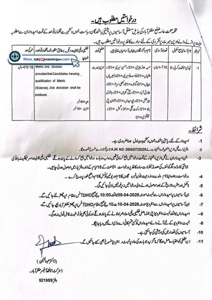 AJK JobsLady Health Worker Job in Health Department, Muzaffarabad Posted on March 13, 2026March 13, 2026 by ajkjobadshelper 13 Mar Job Title Lady Health Worker Department Health Apply Last Date 27-03-2026 ajkjobadshelper Job in Deputy District Education Officer (M) Sudhnuti, AJK Need Manager, for a Guest House in Muzaffarabad