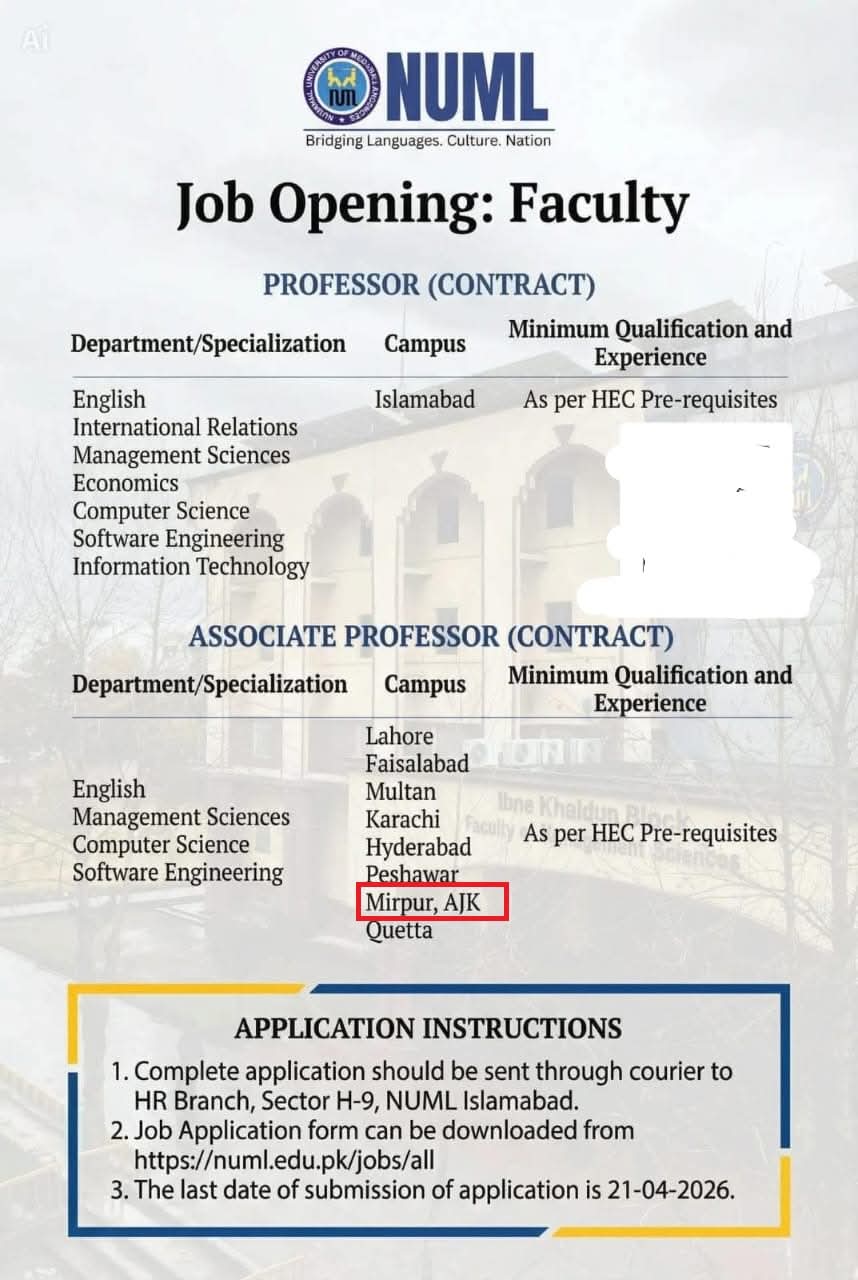 Need Associated Professor at NUML Campus, Mirpur AJK