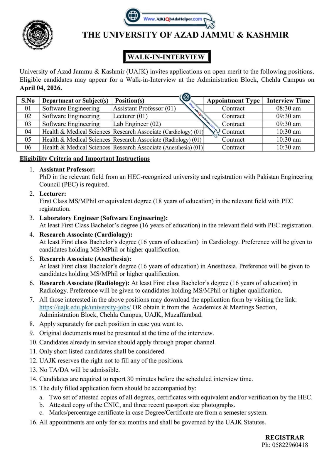 AJK Governments Jobs, AJK JobsNeed Staff at AJK University Muzaffarabad Posted on March 31, 2026March 31, 2026 by ajkjobadshelper 31 Mar 𝐂𝐚𝐫𝐞𝐞𝐫 𝐎𝐩𝐩𝐨𝐫𝐭𝐮𝐧𝐢𝐭𝐲 𝐚𝐭 𝐔𝐀𝐉𝐊Join the University of Azad Jammu & Kashmir through walk-in interviews for multiple academic and research positions. April 04, 2026 Chehla Campus, Muzaffarabad Online website Link Situations Vacant (Click Here to View AD) (Application Form)Click here for online Challan ajkjobadshelper Padua International Excellence Scholarship 2026 in Italy (Funded) International Volunteer Forum 2026 Hungary (100 Fully Funded Seats)