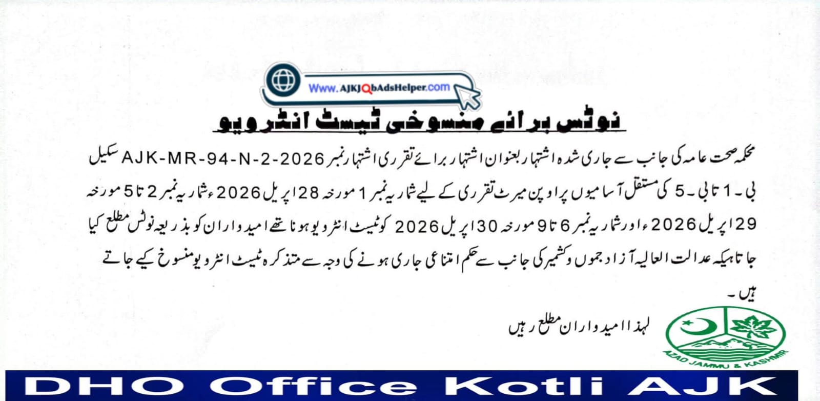 حکومتِ آزاد کشمیر کی جانب سے جاری شدہ اشتہار بعنوان اشتہار برائے تقرری اشتہار نمبر AJK-MR-94-N-2-2026 کے تحت بی-1 تا بی-5 کی مستقل آسامیوں پر اوپن میرٹ تقرری کے لیے شیڈول مورخہ 28 اپریل 2026 تا 2 مئی 2026 مورخہ 29 اپریل 2026 اور شیڈول نمبر 6 تا 9 مورخہ 30 اپریل 2026 کو ٹیسٹ/انٹرویو ہونا تھے، امیدواران کو بذریعہ نوٹس مطلع کیا جاتا ہے کہ عدالت العالیہ آزاد جموں و کشمیر کی جانب سے حکم امتناعی جاری ہونے کی وجہ سے مذکورہ ٹیسٹ/انٹرویو منسوخ کیے جاتے ہیں۔