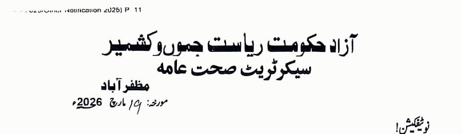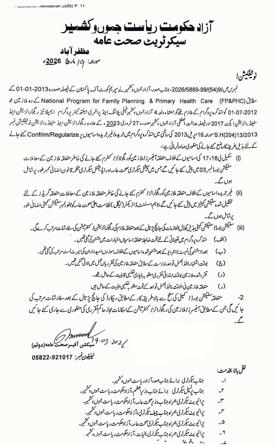 آزاد حکومت ریاست جموں و کشمیر نے نیشنل پروگرام برائے فیملی پلاننگ اینڈ پرائمری ہیلتھ کیئر (FP&PHC) کے ملازمین کی ریگولرائزیشن/کنفرمیشن کے لیے واضح طریقہ کار کی منظوری دے دی ہے۔ یہ منظوری جناب صدر آزاد جموں و کشمیر کی جانب سے سپریم کورٹ آف پاکستان کے فیصلہ مؤرخہ 01 جنوری 2013، عدالت العالیہ آزاد جموں و کشمیر کے فیصلہ مؤرخہ 27 فروری 2023، نیز متعلقہ ریگولرائزیشن نوٹیفکیشنز اور ایکٹ 2017 کی روشنی میں دی گئی ہے۔