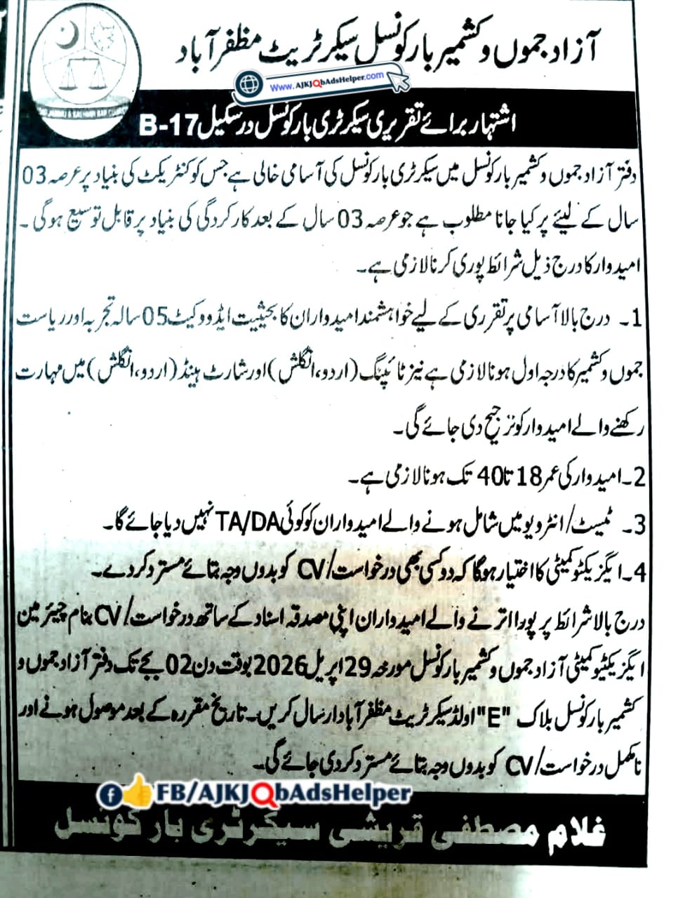 AJK Jobs, AJK Private JobsVacancy for Secretary Bar Council, Bar Council Secretariat, Muzaffarabad Posted on April 17, 2026 by ajkjobadshelper 17 Apr ajkjobadshelper GOVERNMENT OF PAKISTAN (MINISTRY OF DEFENCE) FEDERAL GOVERNMENT EDUCATIONAL INSTITUTIONS (CANTONMENTS & GARRISONS) DIRECTORATE RAWALPINDI CANTONMENTA Job in FEDERAL INVESTIGATION AGENCYHONESTY & INTEGRITY